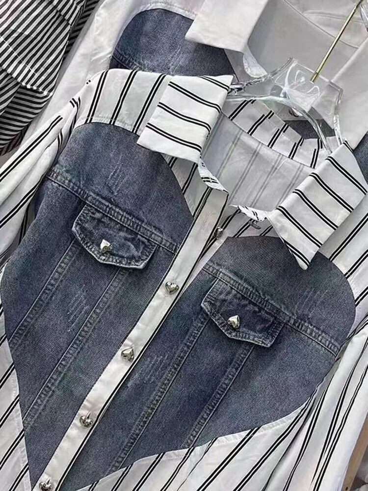 [Ewq] デニム パッチワーク gestreiftes mittellanges Hemd für Frauen loss lässige vielseitige Mode bluse weiblich 2024 Sommer neu 16 o652