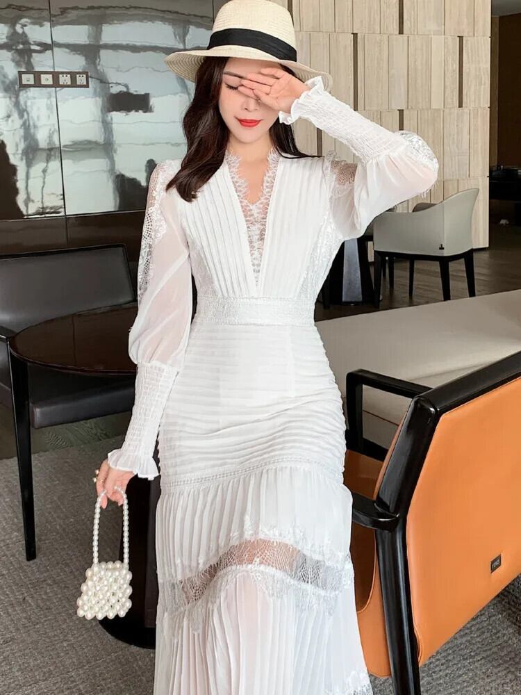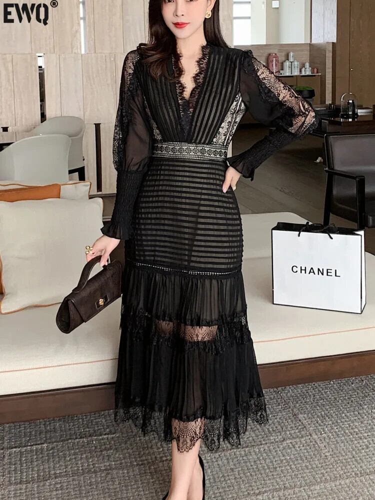 [Ewq] Chique Mooie Jurk Slanke Kleding V-Hals Kanten Patchwork Feestjurken Met Lange Mouwen 2024 Herfst Nieuw 16o1929