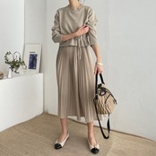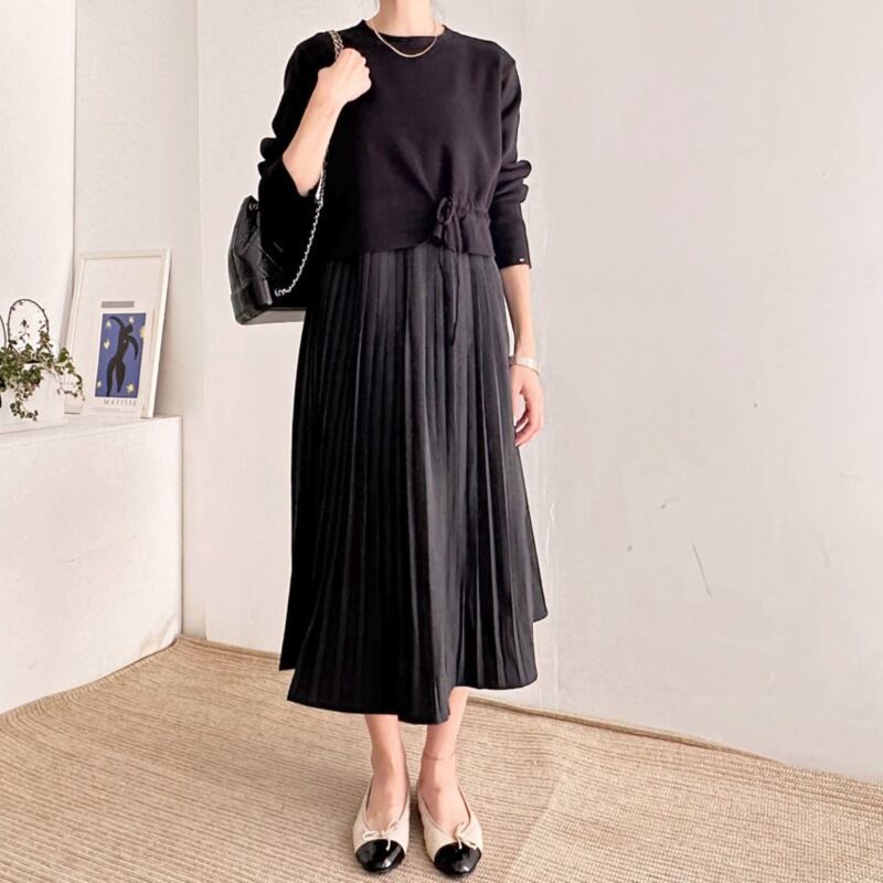 [Ewq] Gebreide トップス Met Trekkoord En Geplooide Rokken Met Lange Mouwen Eenvoudige Effen Dameskleding 2024 Herfstnieuwe Mode 16o1942