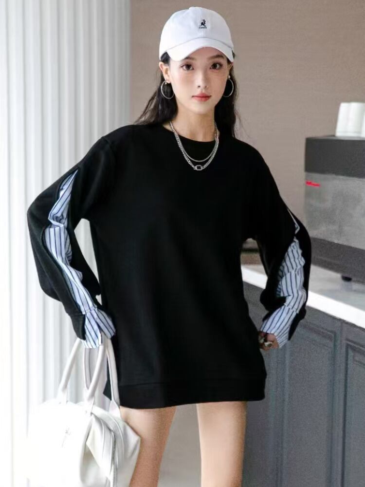 [Ewq] ネップ 2-delige Gestreepte パッチワーク スウェットシャツ Met Lange Mouwen En Modieuze Losse Damestrui トップス 2024 Herfst Nieuw 16o1846