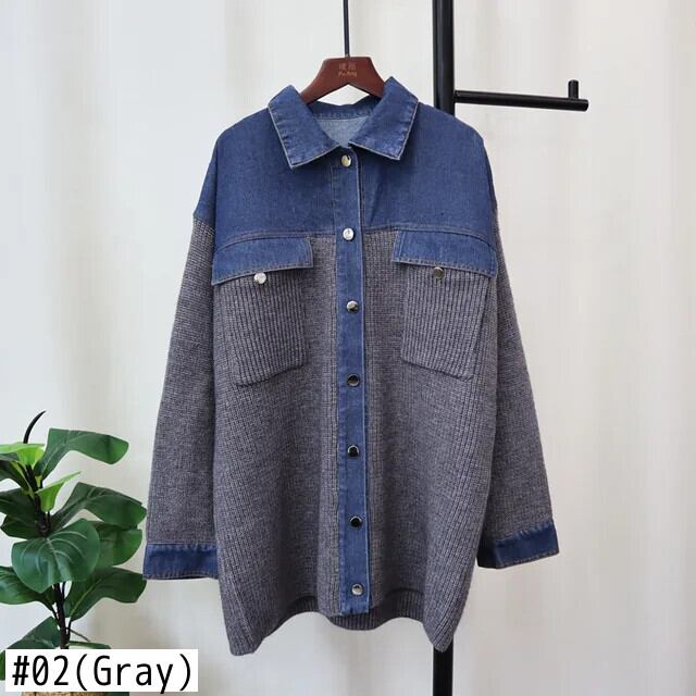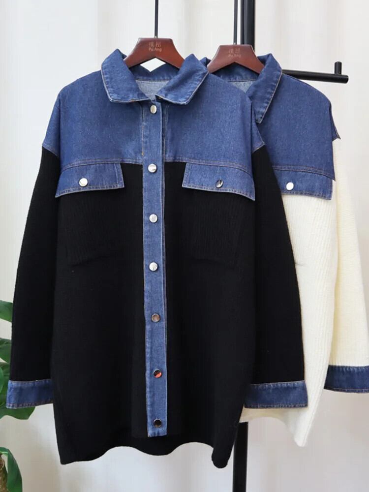 [Ewq] anse Losse Stijl デニム Gesplitst Lange Gebreide Trui Vest パッチワーク Dameskleding 2024 Herfst Nieuwe Mode 16o1108