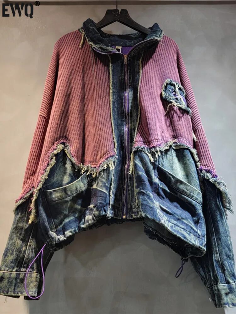 [Ewq] ランガルムサウム デニムパッチワーク Strick oberteile Winterkleid ung Frauen プルオーバー Jacke Herbst neu y2k u1330 ウィンター 冬物