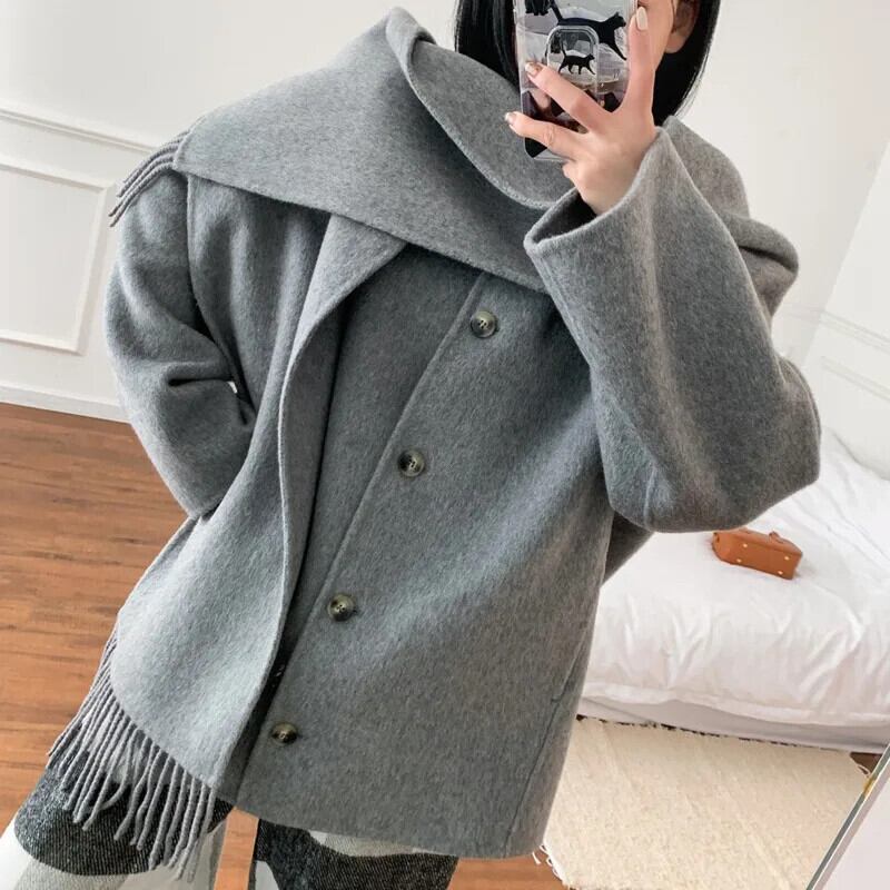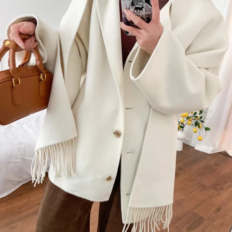Ewq-Use両面カシミヤコート、長袖、タッセルスカーフカラー、シングルブレスト、ウールコート、16o2042、冬秋、2024