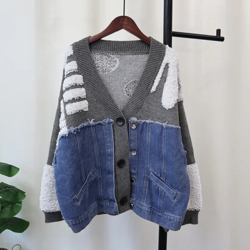 [Ewq] Gespleißte デニム-Kontrast farben Langarm-Strickjacke V-Ausschnitt Einreiher Damen プルオーバー Mäntel Herbst neu 16 o1961