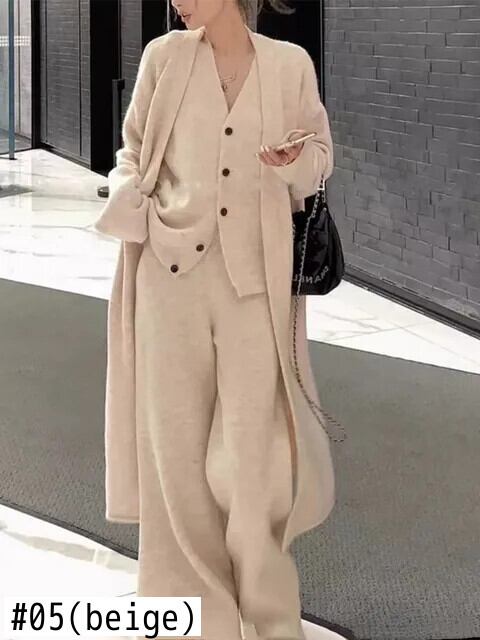 [EWQ] アインレイヒゲ タンクウェスト、ランガー プルオーバー、Strickjacke und elastische Hose mit hoher Taille、Damen-Strick-3-teliges セット 2024、Herbst 16O2345