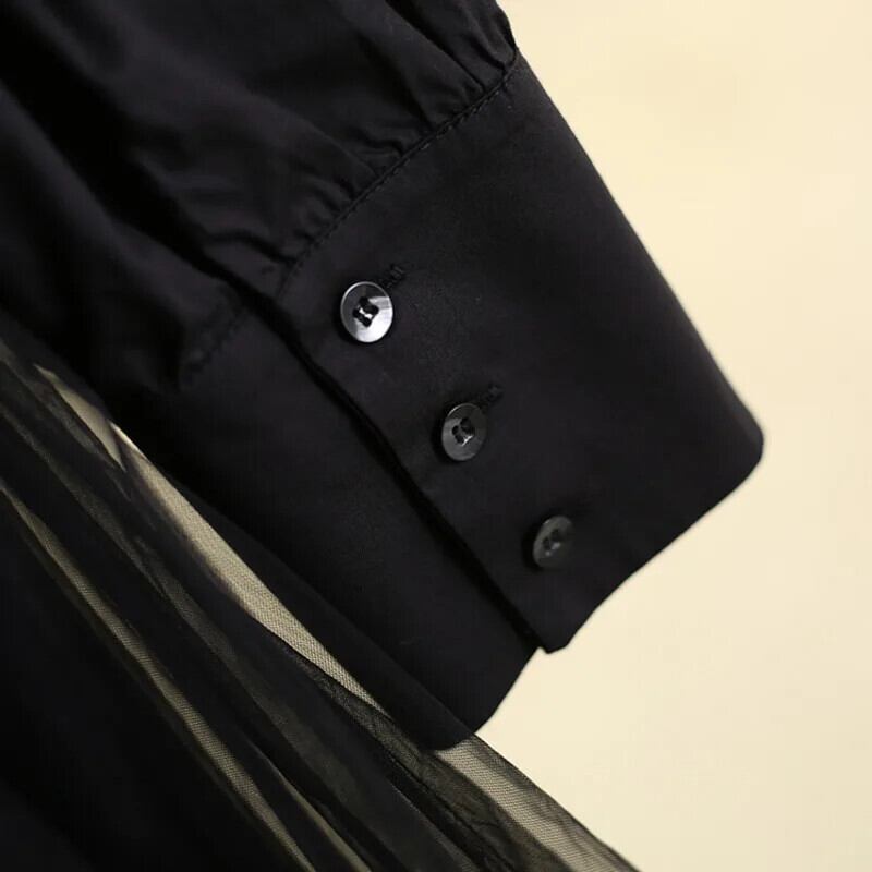 [Ewq] パッチワーク unregelmäßiges メッシュ - Langarm Strickkleid Schleife Decoration Frauen schwarze Kleider Herbst neue Mode 16 o2571