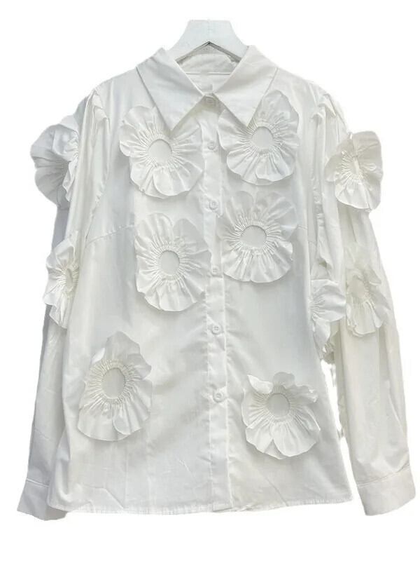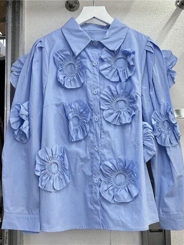 [EWQ] Stil Einzigartige 3D Floral Solide Blusen Volle Hülse Einreiher Shirts Schöne Frauen 2024 herbst Neue GZ286 シャツ 花柄 ソリッドカラー