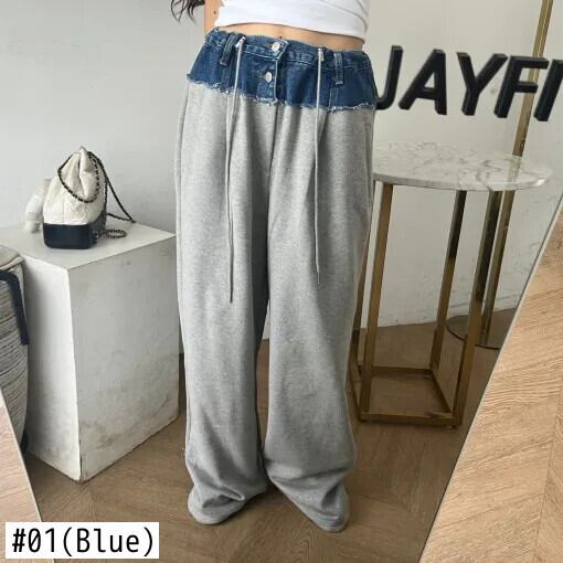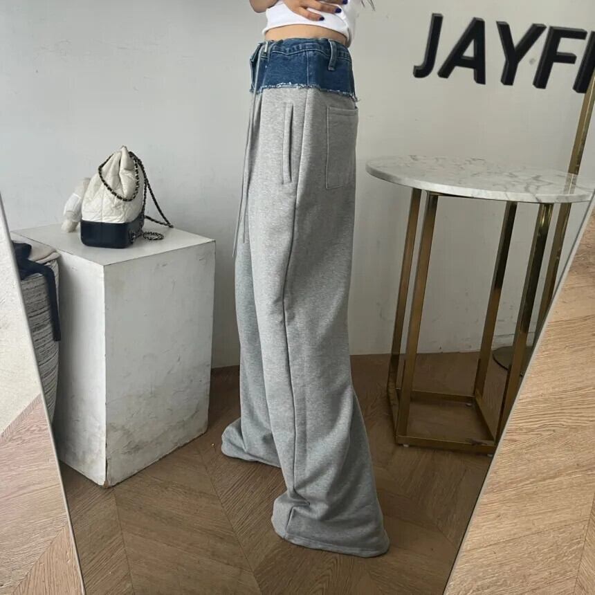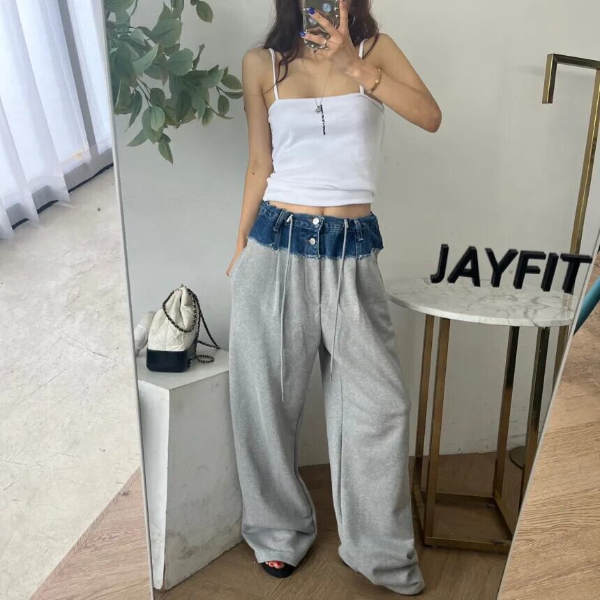 [Ewq] ストリート-スティル パッチワーク ホース mit weitem Bein y2k Kordel zug デニム Spleißen ジョギング ホース ホース 2024 Herbst neu 16 u8284