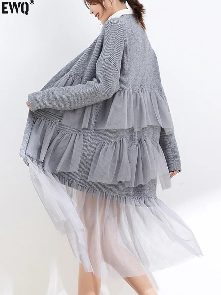 [EWQ] ウィンター Kleidung Frauen Große Größe トップス Grau Strickjacke Gestrickte Warme Strickjacke Mesh Spleißen プルオーバー Mäntel 2024 herbst Neue 16O2341 冬物 メッシュ