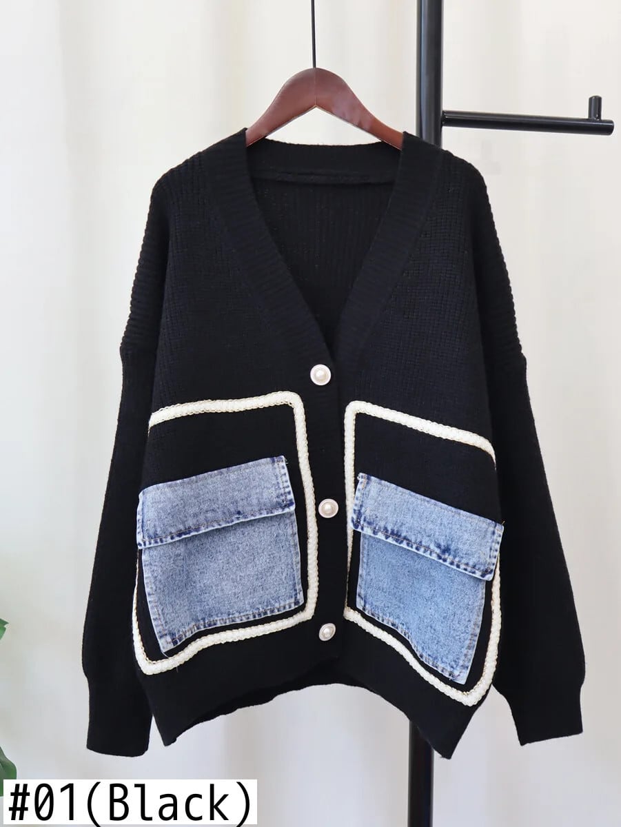 [Ewq] V-Hals Losse Vest Dames Lange Mouw Enkele Rij デニム Zakken Trui Jas Gebreide Kleding Herfst 2024 Winter Nieuw ウィンター 冬物