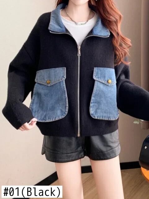 [Ewq] Langarm gespleißt デニム große Taschen gestrickte Strickjacke lässig パッチワーク フラウエン プルオーバー Mäntel Herbst neu 16 o1557