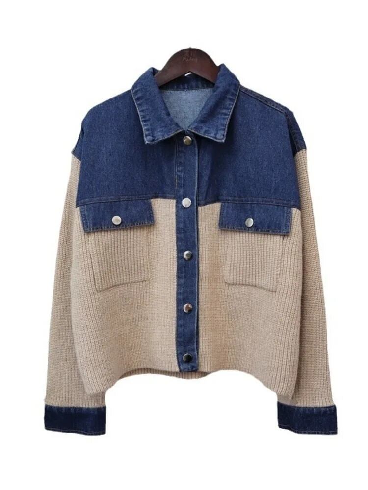 [Ewq] anse Stijl デニム Gesplitst Korte Gebreide Trui Vest パッチワーク Losse Dameskleding 2024 Herfst Nieuwe 16o1107