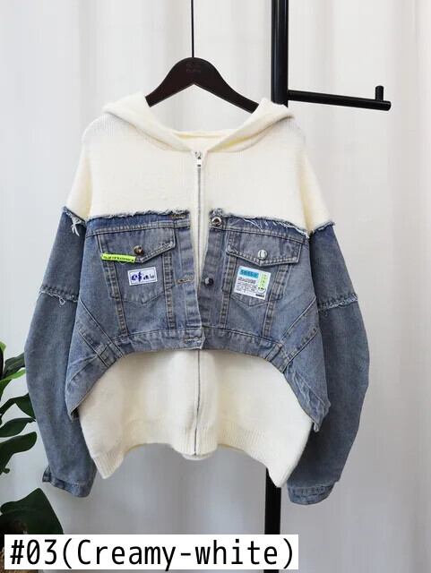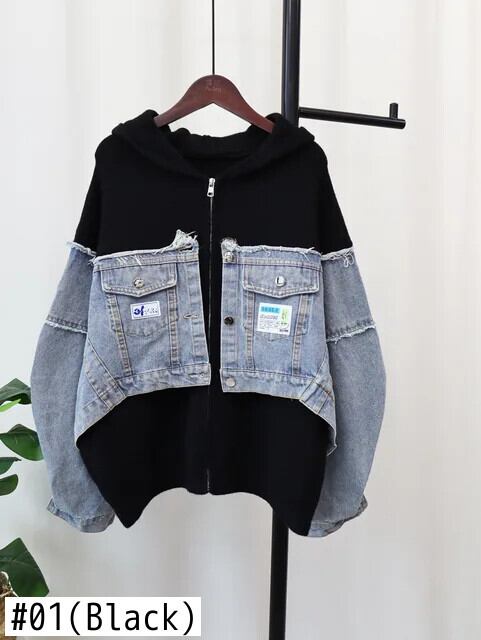 [Ewq] ストリート Stijl Rits Capuchon Dameskleding デニム パッチワーク Trui Jas Herfst 2024 Winter Nieuw Tij Gz258 ウィンター 冬物