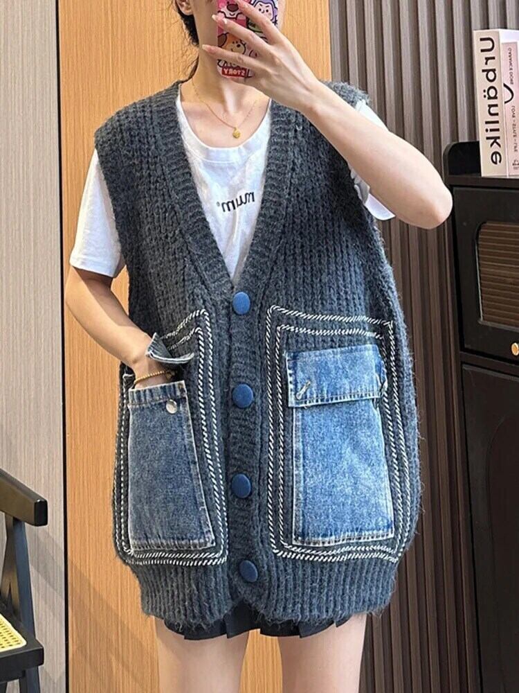 [EWQ] Süße オールマッチプルオーバー、デニム、gespleißte Tasche、gestrickte Weste、Mantel、Damen、Herbst、Winter、2024、neue Mode、graues タンクトップ U5087 ウィンター 冬物